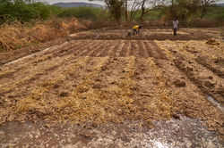 This study is conducted in three block replicates of 10m by 10m area with each block subdivided into four plots. Each plot is treated with different moisture conservation measures. The first plot is put under farmers practice, the second under furrows, the third under mulch and the fourth under a combination of both mulch and furrows. These treatments are randomized.